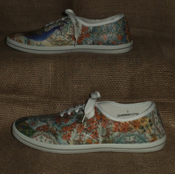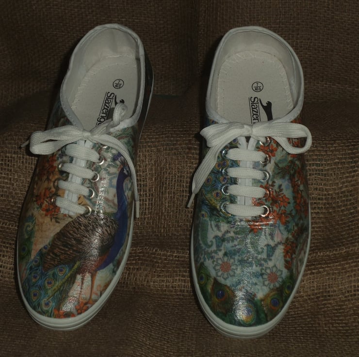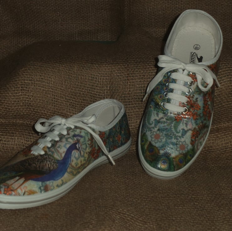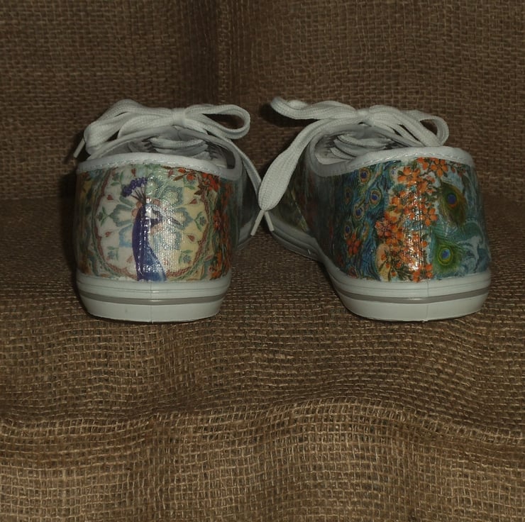 Decorated Canvas Shoes SIZE 7 Peacock Individual Unique Decoupage Unusual Gift