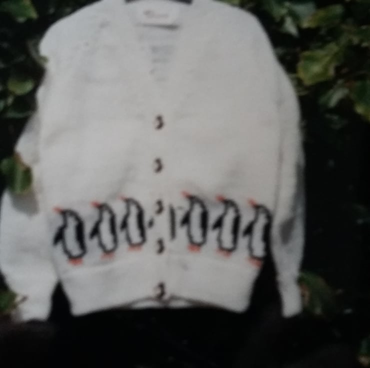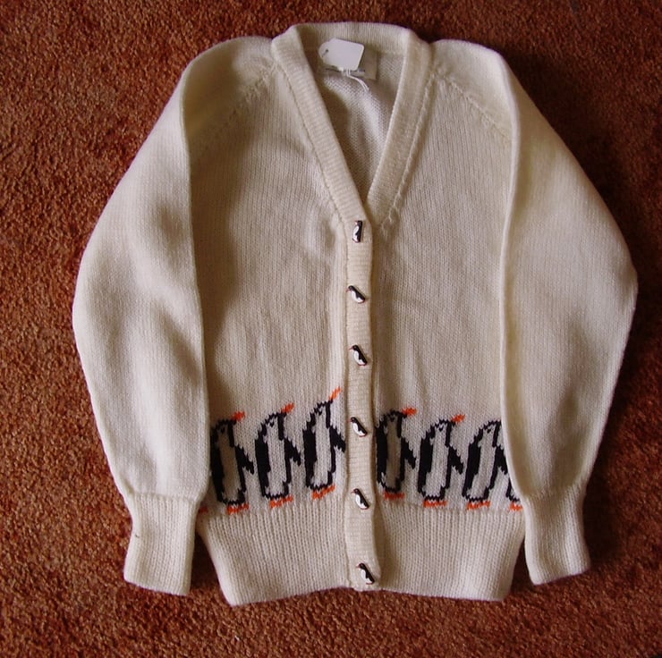 Penguin cardigan for a child. Penguins all round the bottom in black and orange to match the buttons. It looks best on white or cream. It can be made in machine washable merino blend wool or cotton. As it is made to measure please order by the age of the child.