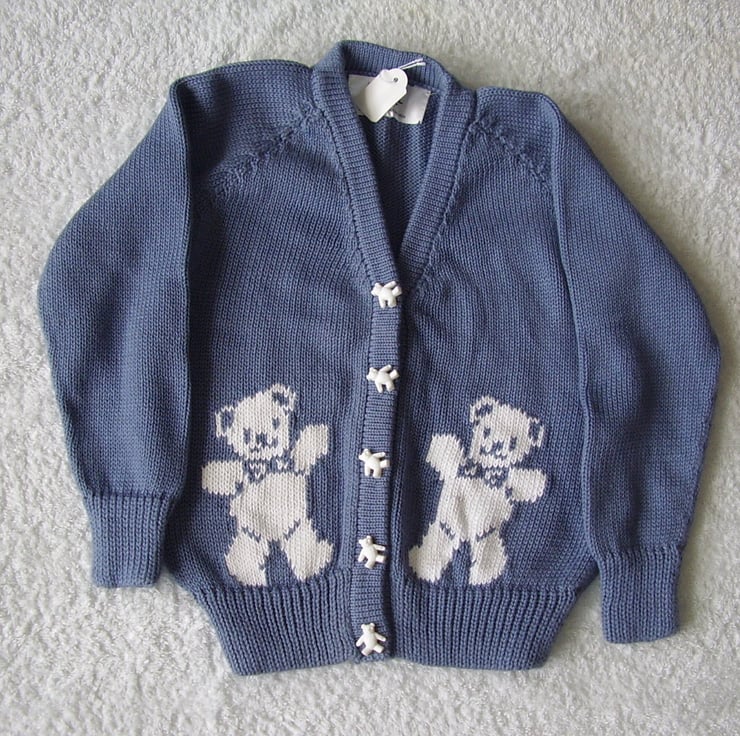 Teddy Bear cardigan with a teddy bear motif on each front and teddy bear buttons to match in either white or yellow. The cardigan can be made in any colour with a bear to match. Most popular seems to be Navy with yellow or pink with white. This one is a slate blue. They can be made in machine washable merino blend wool or cotton.