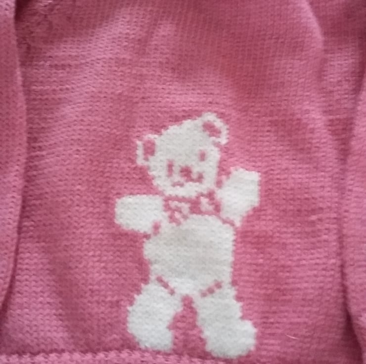 Every child loves a teddy so I thought putting them on a cardigan was a good idea. |The same motif can also be put on a jumper. I made jumpers for teddies for a teddy bear shop for a while with pictures of teddies on the front of them and often the child owning the teddy who was going to get the jumper wanted one as well.