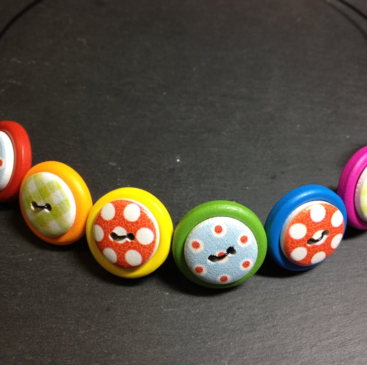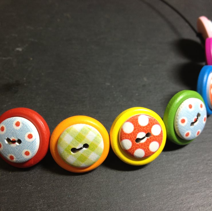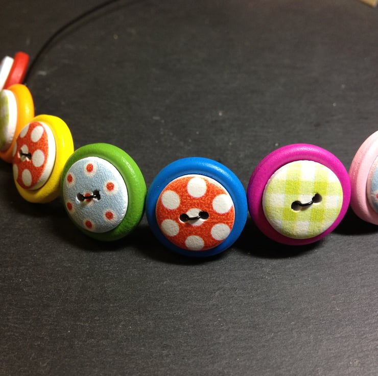 A recent new addition to kitsch creations, these button necklaces have been made by layering brightly coloured wooden buttons with smaller polkadot and gingham designs onto a semi-rigid coloured coated beading wire choker for a vibrant take on the shabby chic look.