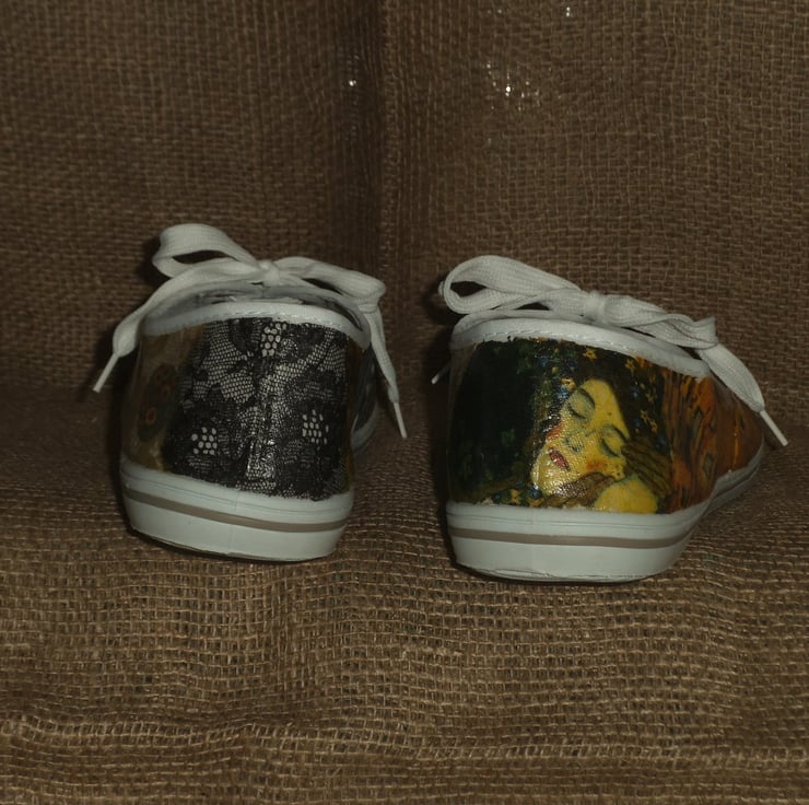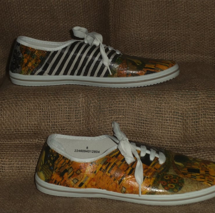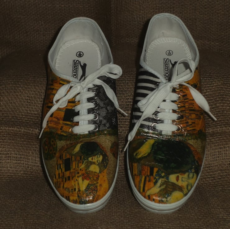 Two different views of Klimt’s The Kiss are on the front of the shoes, with lace and stripes on other parts.