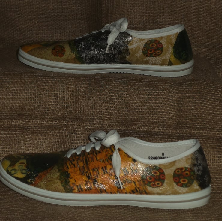 These canvas shoes have been individually decorated with napkin decoupage, carefully layering a collage of images from complementary paper napkins. I have purposefully decorated the two shoes differently for more impact but made them so that they match or reflect each other when seen and worn together.