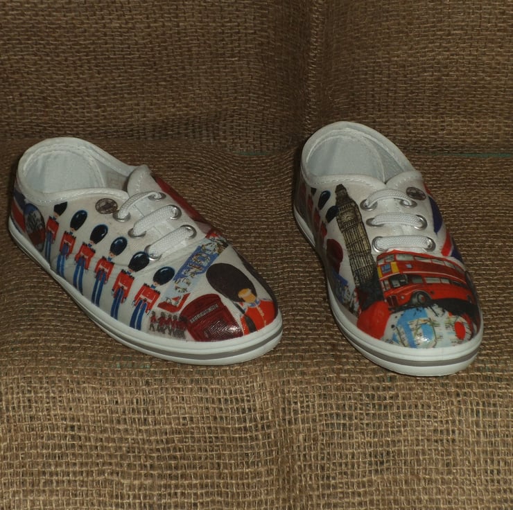 A collage of London and Great Britain images is on each shoe, including Big Ben, the Union Jack flag, telephone boxes, buses and Buckingham Palace guards with their Busby helmets.