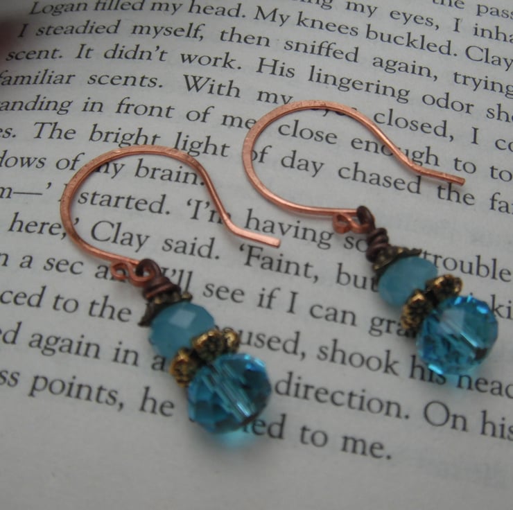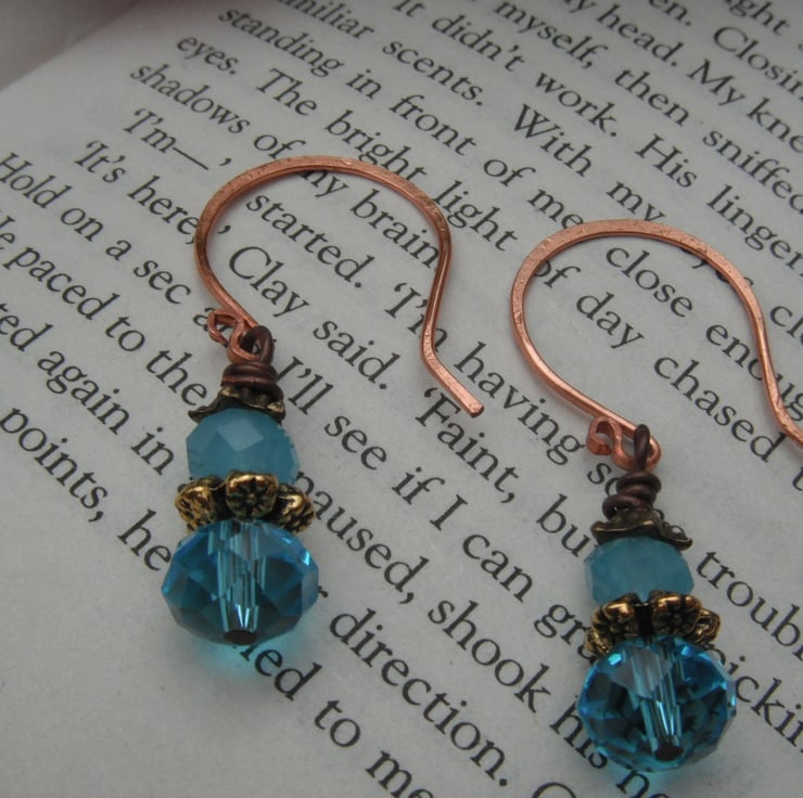 Bright blue, and beautiful opaque blue faceted, Czech glass crystal beads, embellished with vintage tone bronze/gold spacers and findings, suspended on hand forged copper wire ear wires.