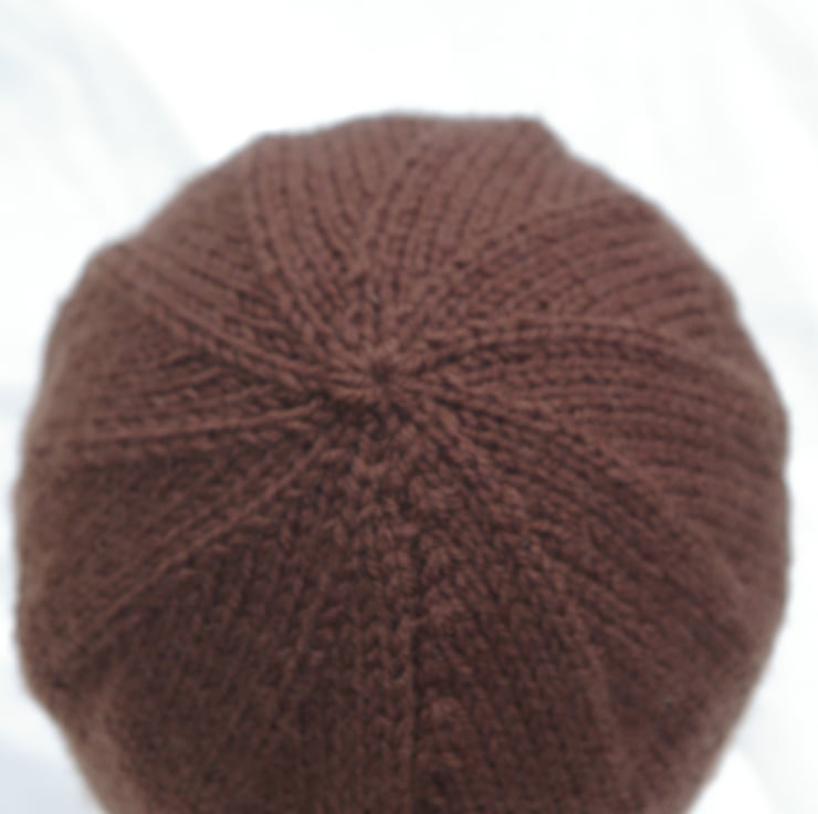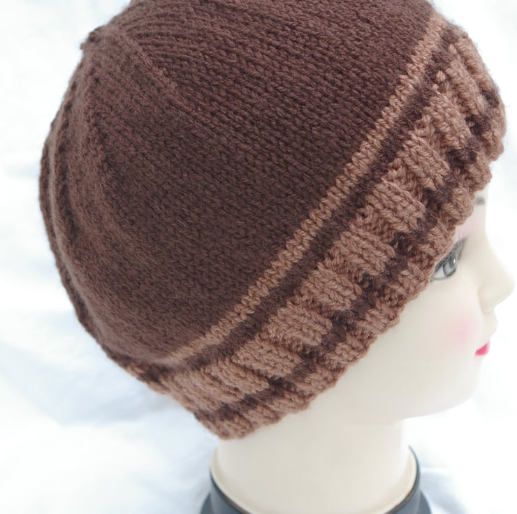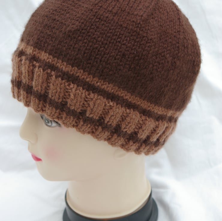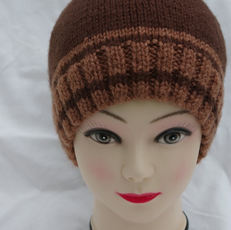 This two tone brown beanie hat is just the item to keep your head warm in cold weather.. The dark and light brown yarns have been knitted in stripes around the hat. Hand knitted with a soft aran weight Acrylic yarn for easy care as it may be machined washed up to 40% and laid, flat to dry.