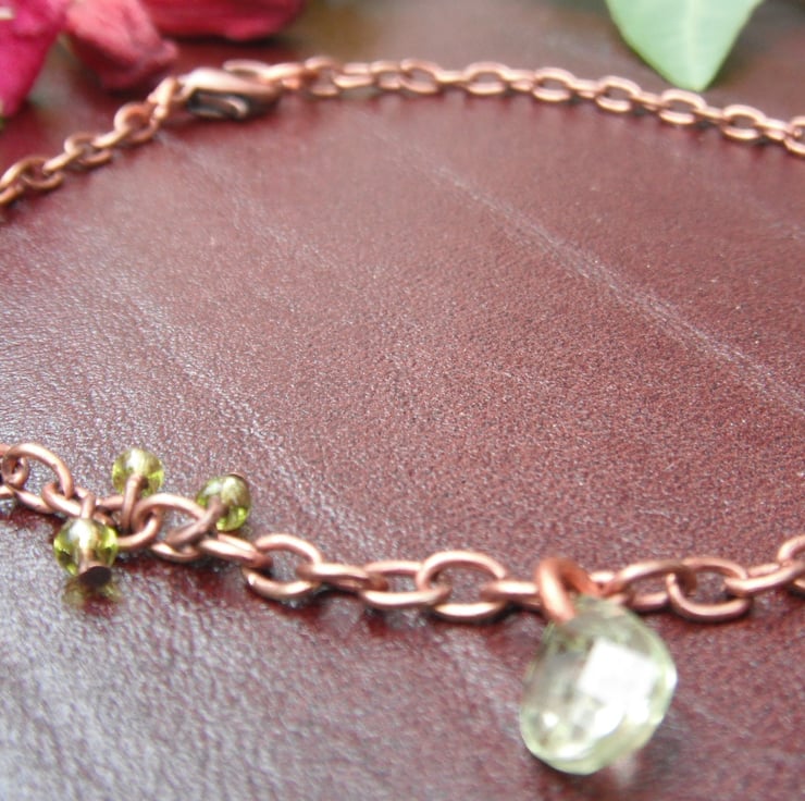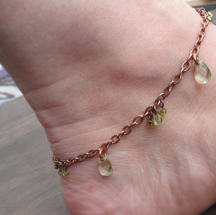 Copper chain, with delicate acrylic faceted tear-drop beads, and peridot seed beads.
