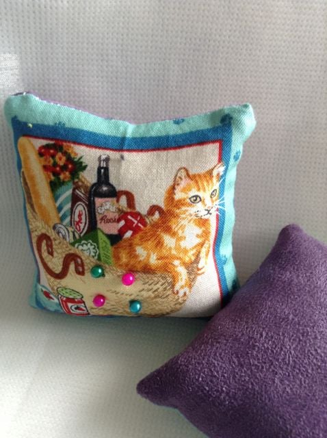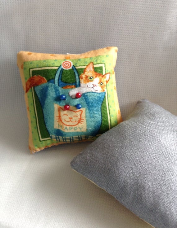 Pretty little handmade padded cat patterned cotton square pincushion. Underside in a plain suede like material, cushion comes with a couple of pins. Let us know which you would like. Machine washable. 8cm by 8cm