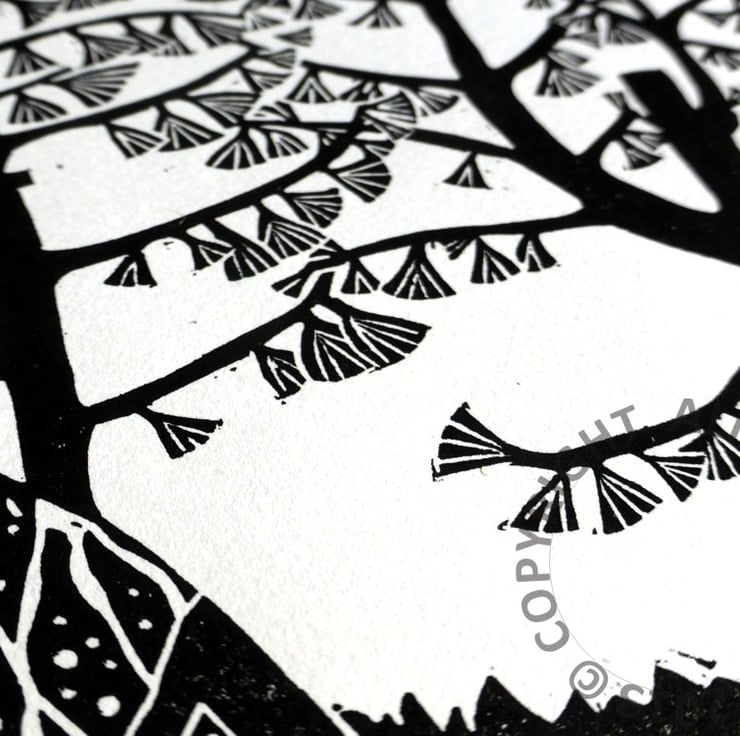 This is an original lino cut print (limited edition of 30 in this colour). Printed from a hand-cut lino plate in black with oil-based but water washable inks onto good quality printing paper. The printed area is approximately 21cm in diameter. It supplied in a white mount to fit a 30x30cm frame (other sizes available).