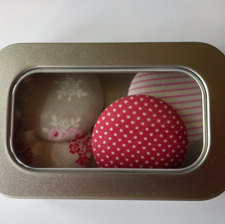 A set of 5 fabric covered button magnets measuring 3.8cm in diameter, covered with fabulous fabric from Tilda's Sweet Christmas range, glued with industrial strength glue to a ferrite magnet.