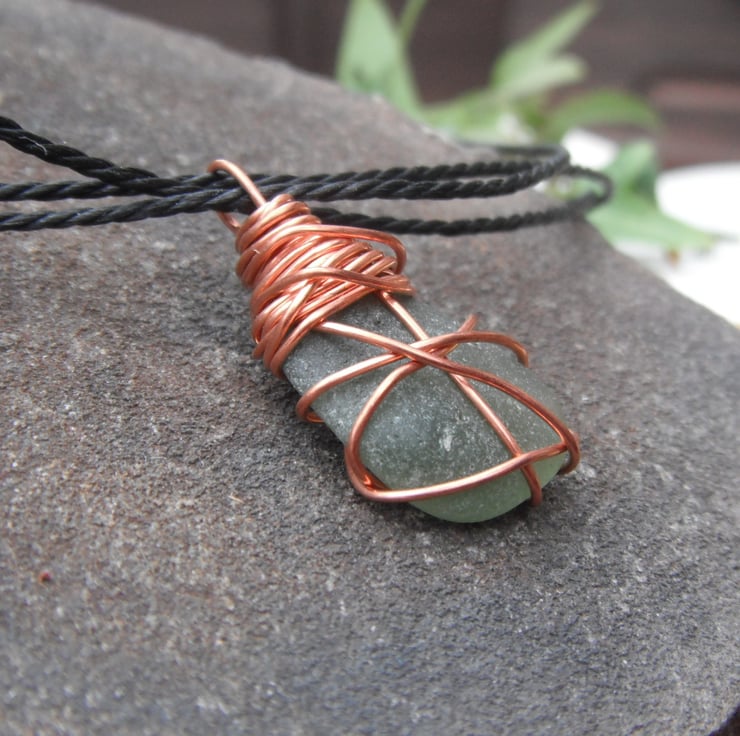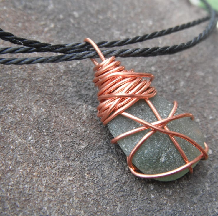 A hand wrapped pale green sea glass pendant, suspended on a triple strand 1mm black waxed cotton cord, fastened with a hand forged swirl 'S' hook clasp, with matching earrings on hand forged ear wires.