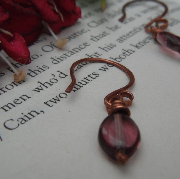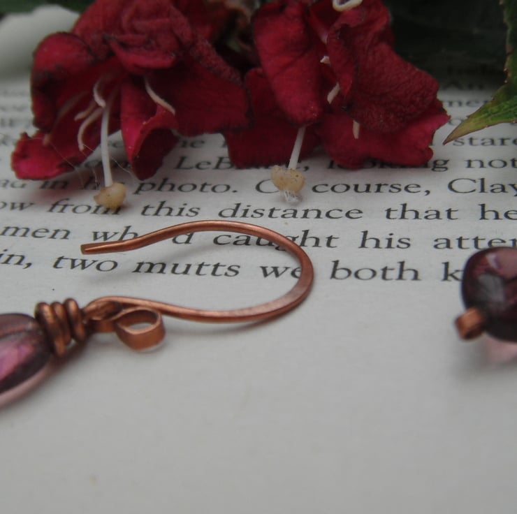 Wonderfully, delicate, amethyst glass beads, wire wrapped, and suspended on hand forged ear wires.