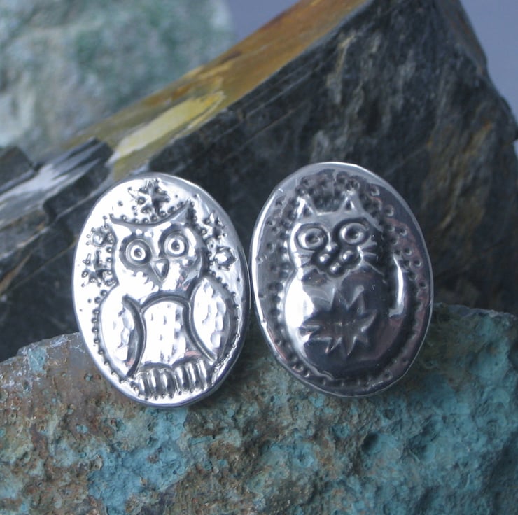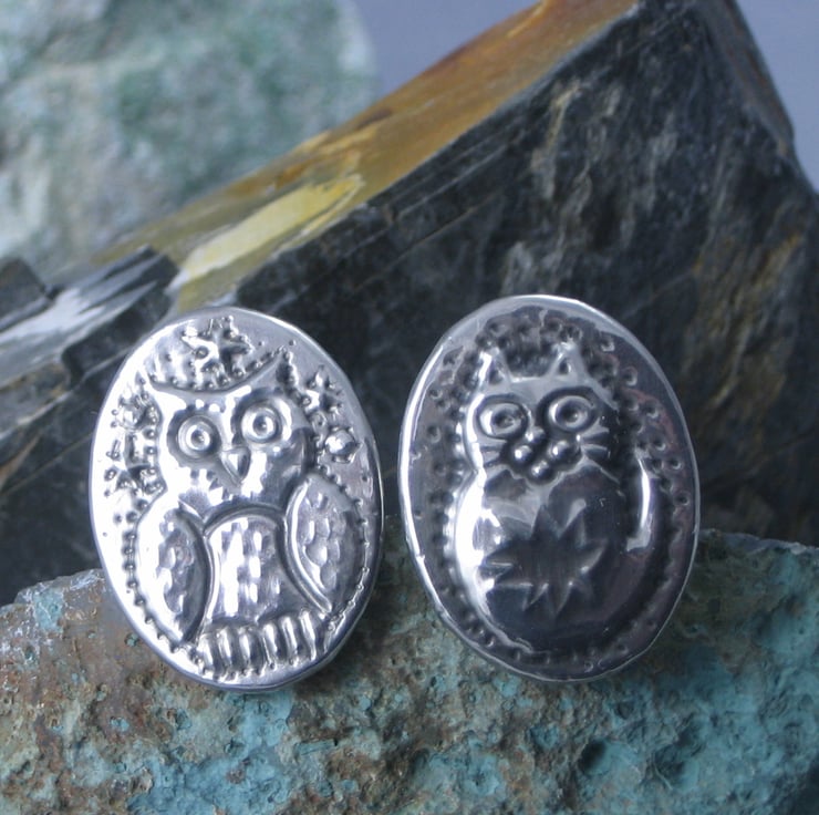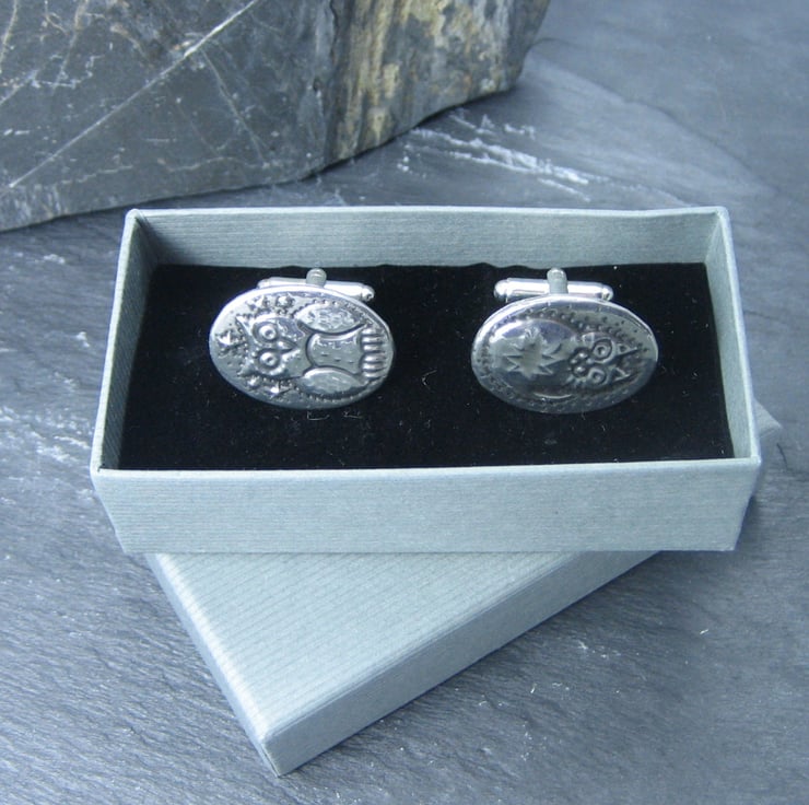The Owl and the Pussycat went to sea...... These cufflinks have been individually hand-crafted in shiny modern pewter, and feature the romantic pair from Edward Lear's rhyme. Each one measures 26 x 20mm. Presented in a smart grey gift box. A great gift for a 10th Wedding Anniversary, Fathers' Day, Valentine's Day or Birthday. Father's Day.