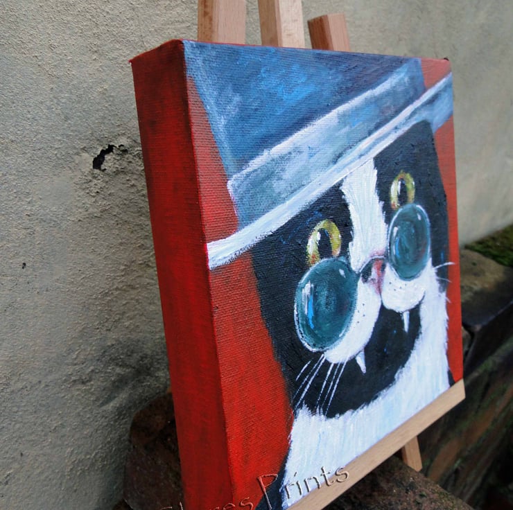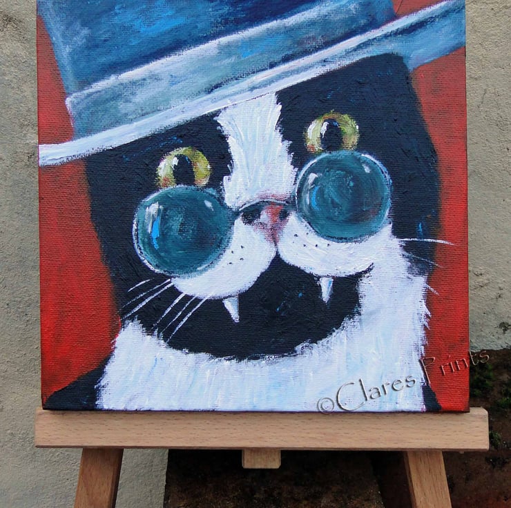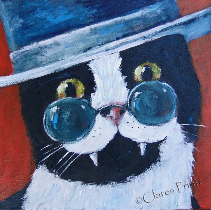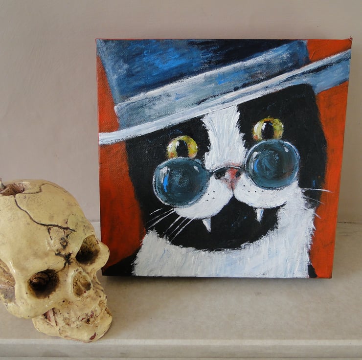 Original acrylic painting on canvas of my cat Morpheus in his Dracula top hat and round glasses with his vampire fangs on show!