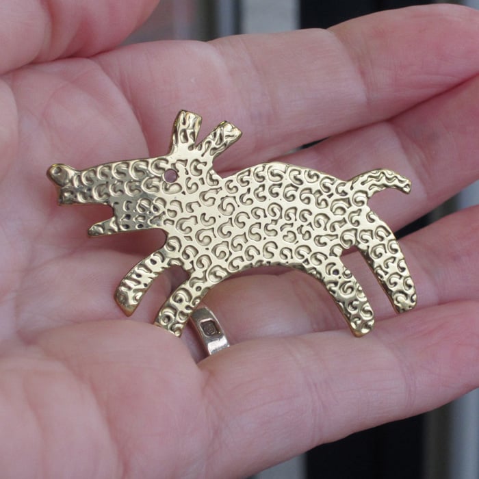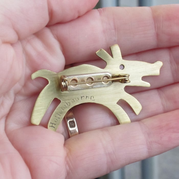 Made from sheet brass,hand sawn, the pattern is then drawn on by hand then etched.He has a coat of lacquer and a safety catch soldered to the back. I have signed it Hollowbourne on the back.
