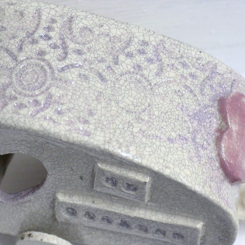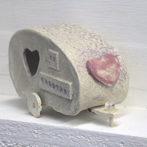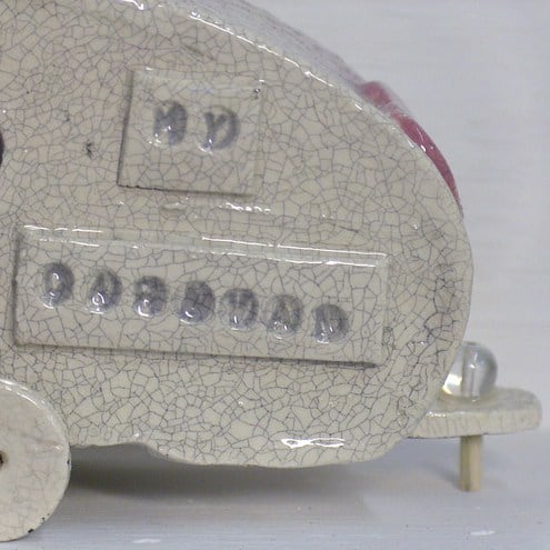 This is a handmade ceramic caravan.The side has a little heart shaped window, and is decorated with the words 'My Caravan' the other side is plain finished in a crackle glaze.The roof is decorated with a lace pattern coloured in a lovely lilac coloured underglaze.