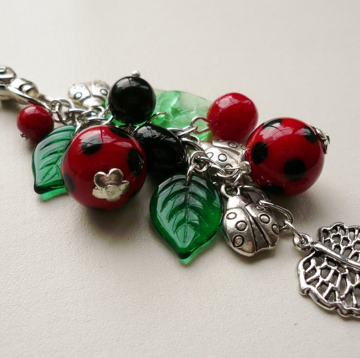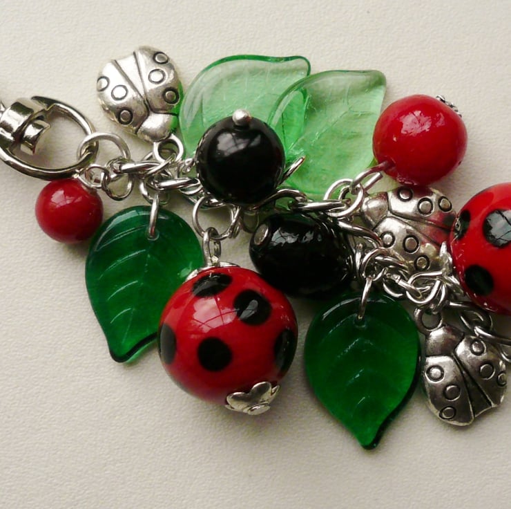 This handbag charm is made up of 15mm round spotted glass beads combined with 15mm long green glass leaves, various other red and black glass beads and Tibetan silver ladybird charms. A silver plated 20mm leaf pendant hangs below. All attached to a silver plated chain and 35mm trigger clasp.