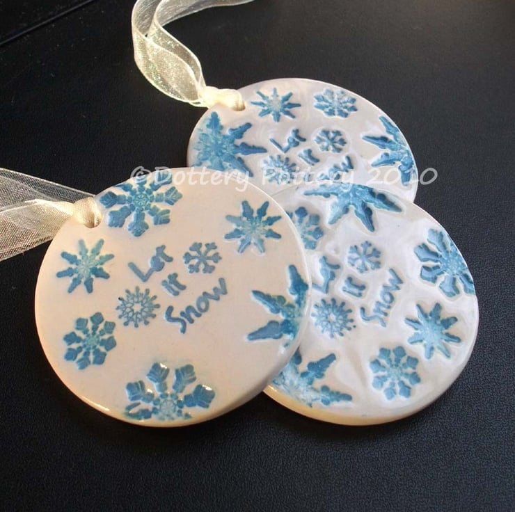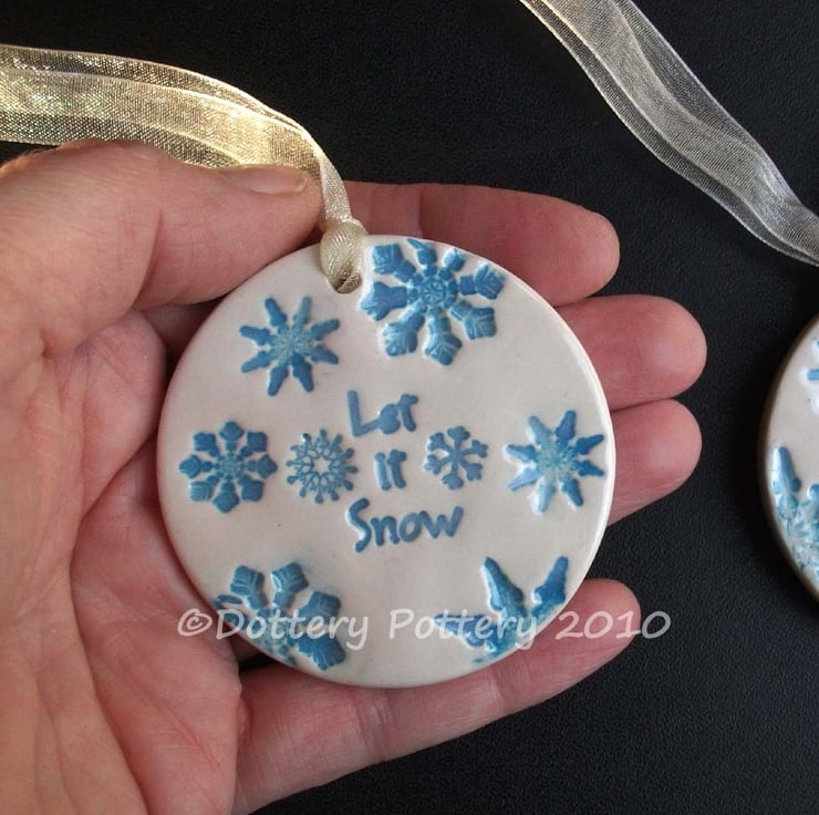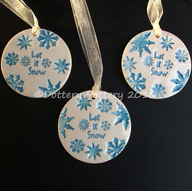 This set of 3 let it snow snowflake decorations are made from white earthenware clay and twice fired to a top temperature of 1100 degrees so are nice and strong.