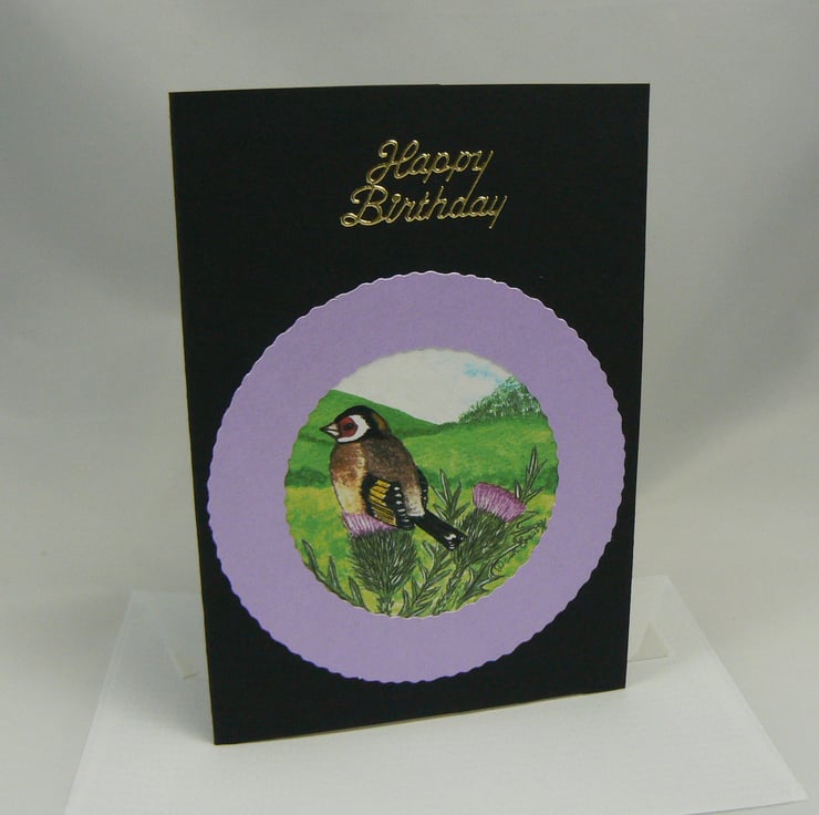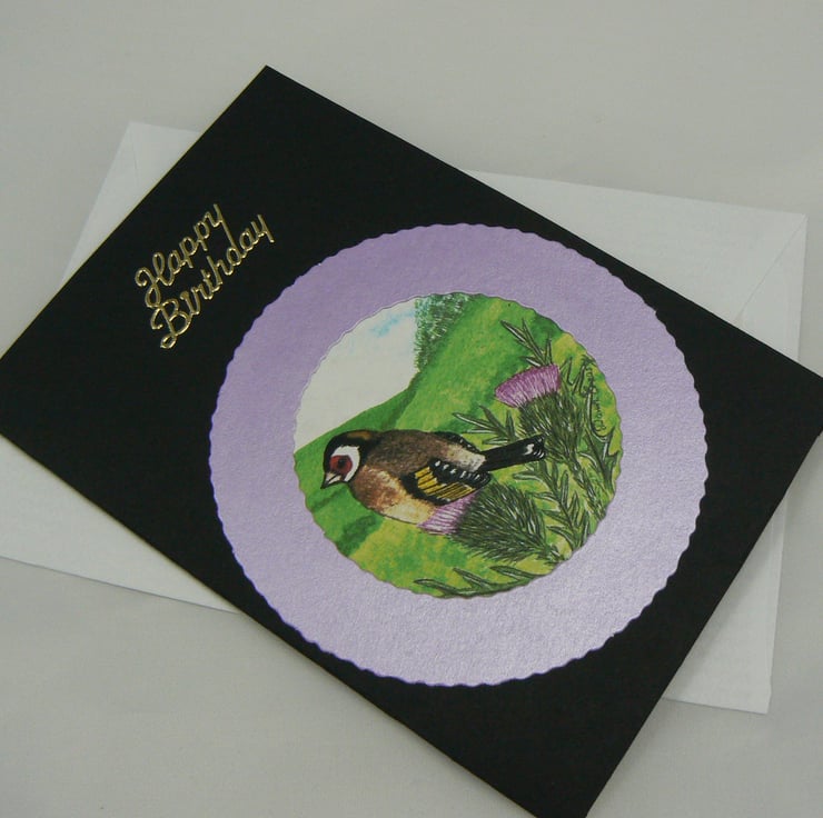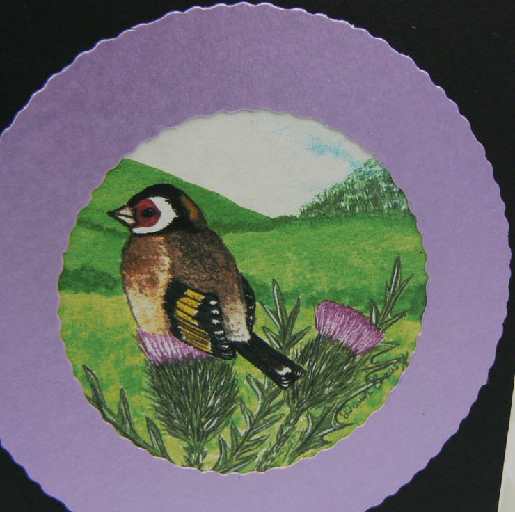 This card features a print of one of my original watercolour painting of a little goldfinch perched on a thistle. This card measures 10.5 x 14.8cms and has a scented insert with the sentiment 'best wishes' on, it comes with envelope in a cellophane bag.