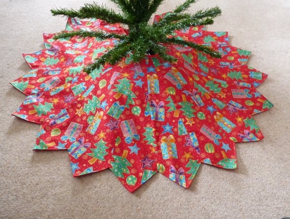 This beautiful bright Handmade Christmas Tree Skirt is perfect for any size tree. Its made to fit over the ChristmasTree stand and to hide the untidiness. Its made up of 18 sections of Red fabric with a Christmas Tree and Christmas Present print which is sewn together and finished off on the back with red felt. There is also a Red Grossgrain ribbon to fasten together around the base of the Christmas Tree. I have also sewn around the edhe with a Gold Thread
