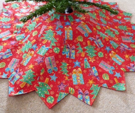 This beautiful bright Handmade Christmas Tree Skirt is perfect for any size tree. Its made to fit over the ChristmasTree stand and to hide the untidiness. Its made up of 18 sections of Red fabric with a Christmas Tree and Christmas Present print which is sewn together and finished off on the back with red felt. There is also a Red Grossgrain ribbon to fasten together around the base of the Christmas Tree. I have also sewn around the edhe with a Gold Thread