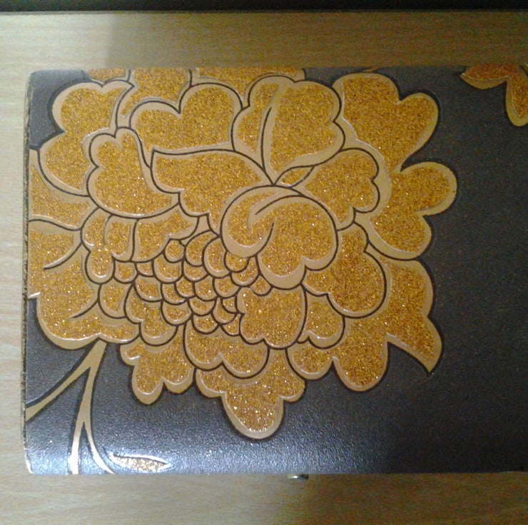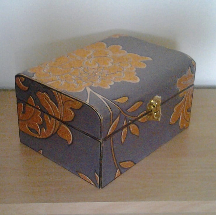 I have used a lovely textured brown and gold paper to decorate this wooden box with brass catch. To bring out the beautiful flower and leaf design I have used a sparkling glittered gold card, each individual piece has been cut by hand and carefully glued into position over the whole of the box creating a beautiful design.
