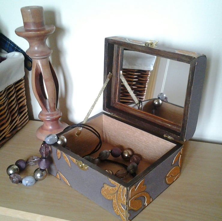 The inside of the box has also been lined with pretty gold paper and has a mirror inlaid into the lid. The whole box has then been coated with a clear varnish sealing the paper and glittered card.