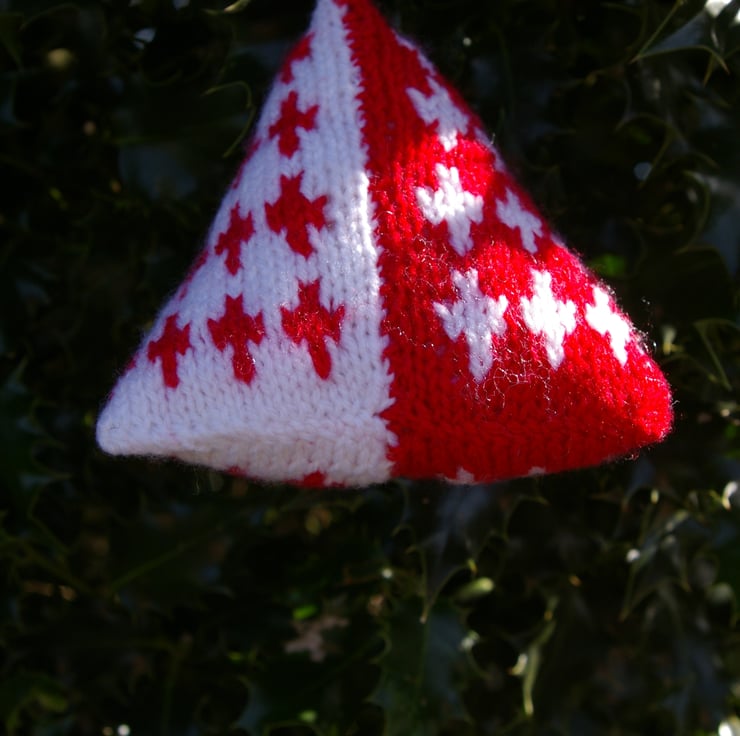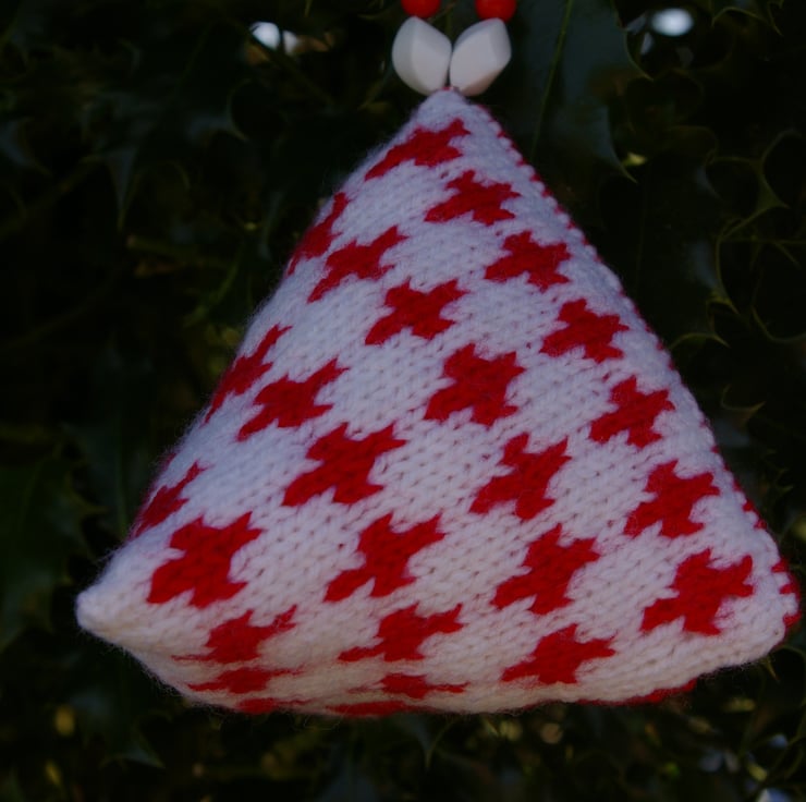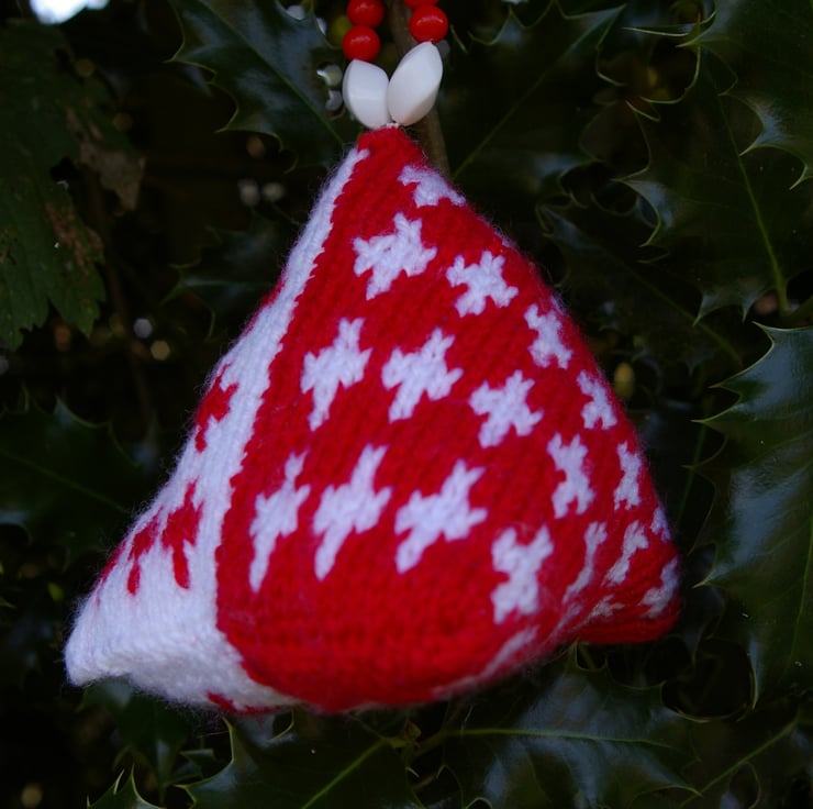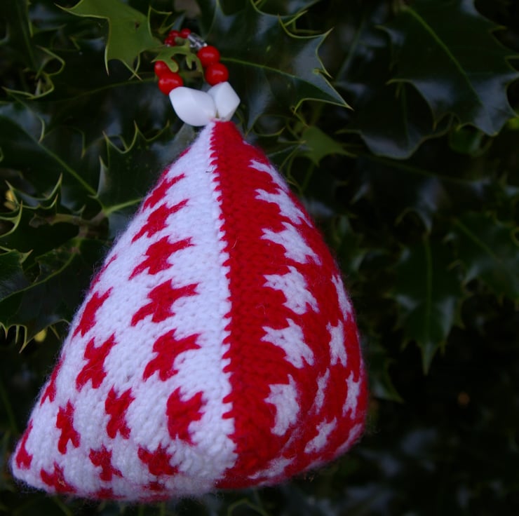 A set of two red and white hand knitted Christmas Humbug Decorations. They are called humbugs due to their unusual shape, the shape of the old humbug sweets. I have designed the pattern on this pair in the Fair Isle tradition. Each one has a hanging loop of red, white and transparent beads. They will look stunning displayed at Christmas.