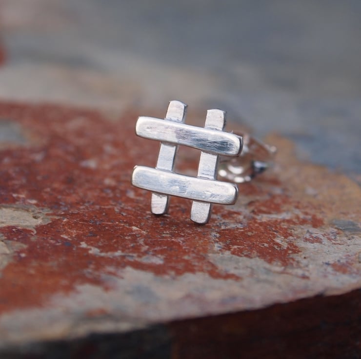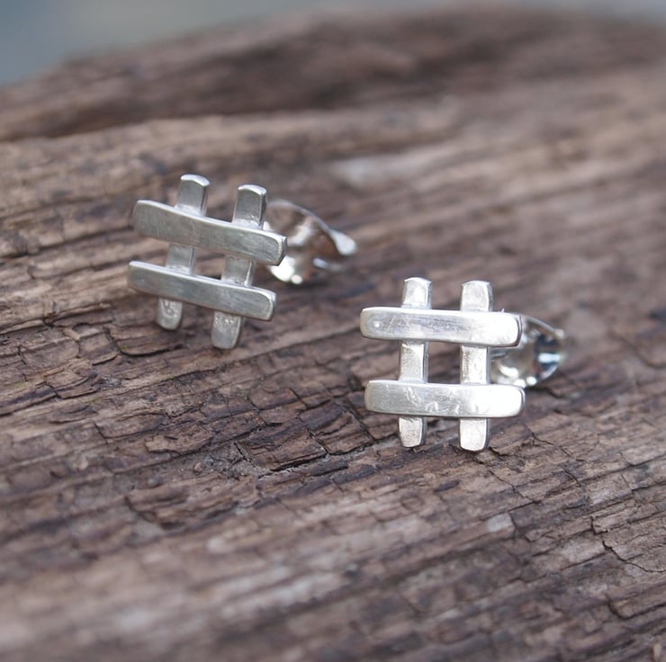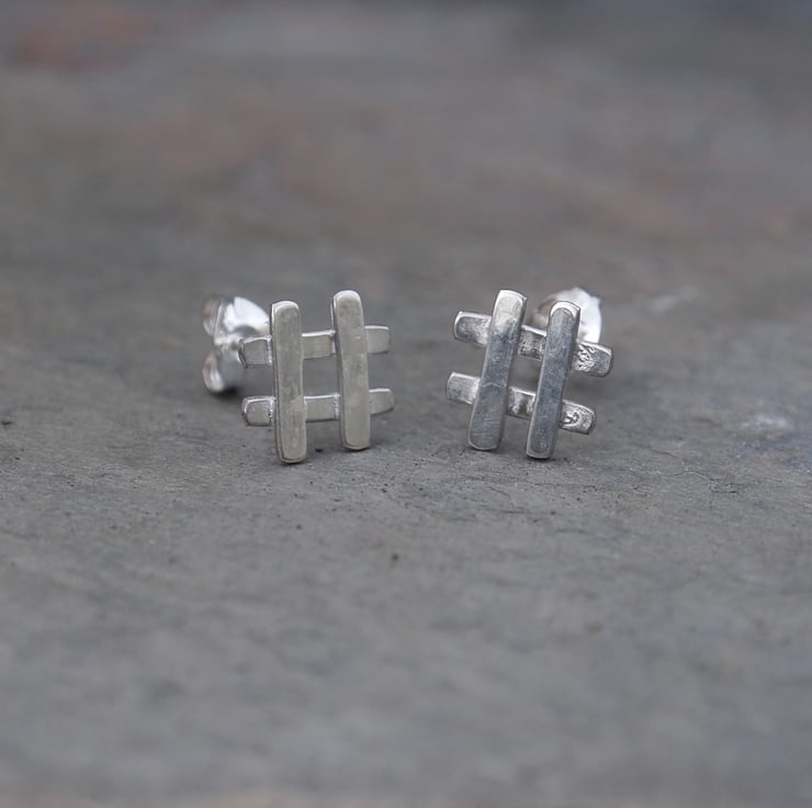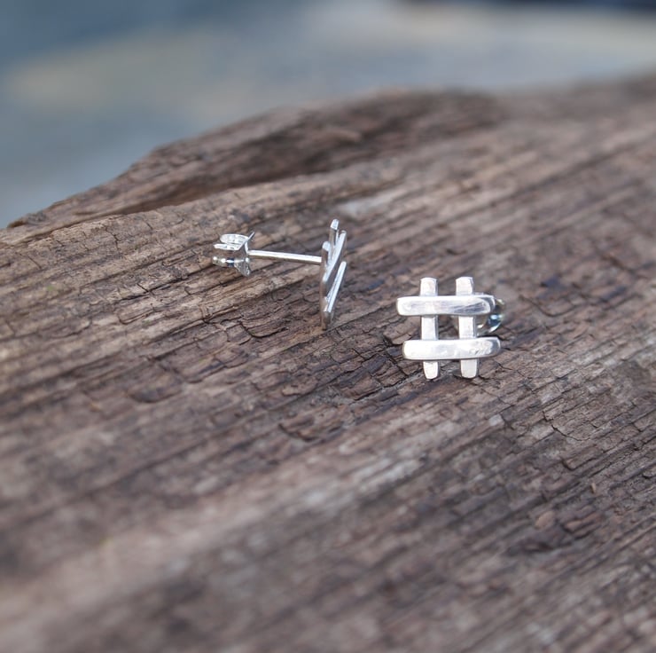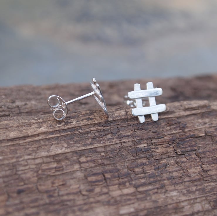 These fun little hashtag style silver stud earrings have been burnished to a soft shine and come with sterling silver ear scrolls/earring backs.
