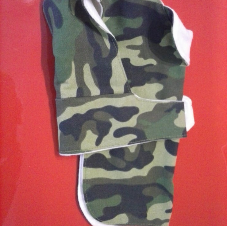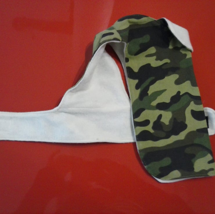 A teeny little chest protector style in a small Chuahua type of size. Made in a strong cotton blend canvas style of fabric, with a cream fleece inner for warmth.