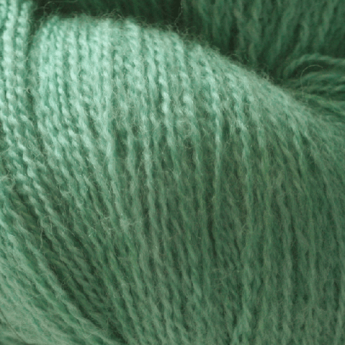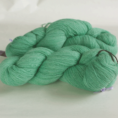 Almost-solid minty green, this yarn will show off detailed lace patterns that may be lost in more variegated yarns. This lofty merino lace yarn has a few slightly fuzzy spots but should make beautiful lace projects. There is one skein left.