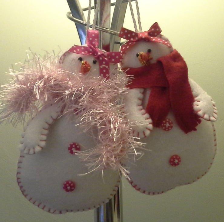 New in for 2013, Felttopia's snowmen have been joined by their more feminine counterparts. They are wrapped up as snugly as the men but bring a little more glamour to the occasion. This particular snow lady has fashioned herself as Miss Scarlett; red polka dot buttons with matching hair bow and a deep red scarf. She is finished off with a shot silk carrot nose.
