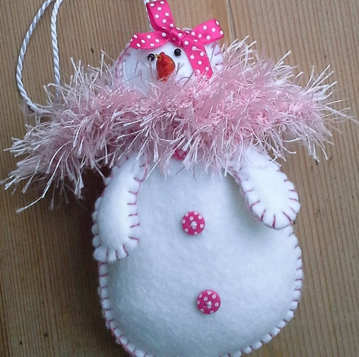 New in for 2013, Felttopia's snowmen have been joined by their more feminine counterparts. They are wrapped up as snugly as the men but bring a little more glamour to the occasion. This particular snow lady has chosen a confection of pretty pink accessories, she has matched her cerise pink polka dot bow to her buttons and is keeping warm with a pale pink scarf knitted from 'eyelash' yarn. She is finished off with a shot silk carrot nose.