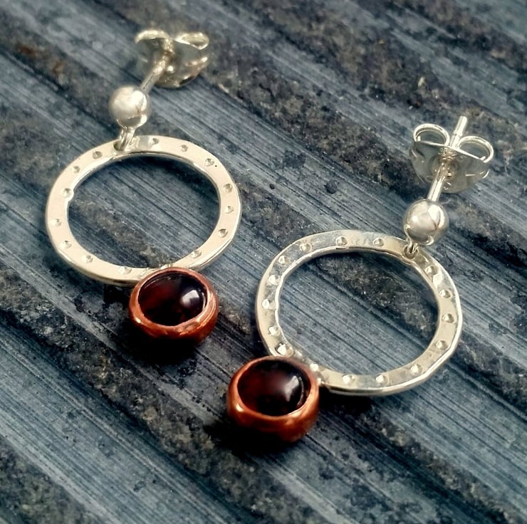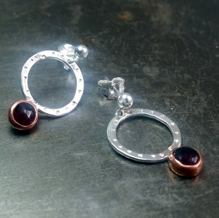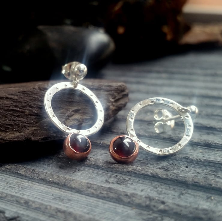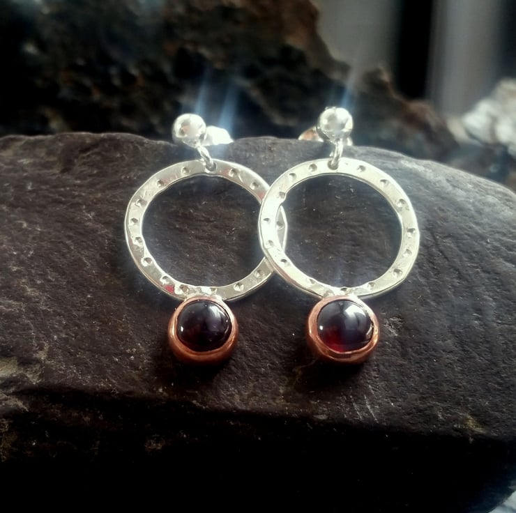 These earring are unusual with the combination of mixed metals, silver hoop hammered flat with dot design and copper setting to enhance the deep red of the garnet.