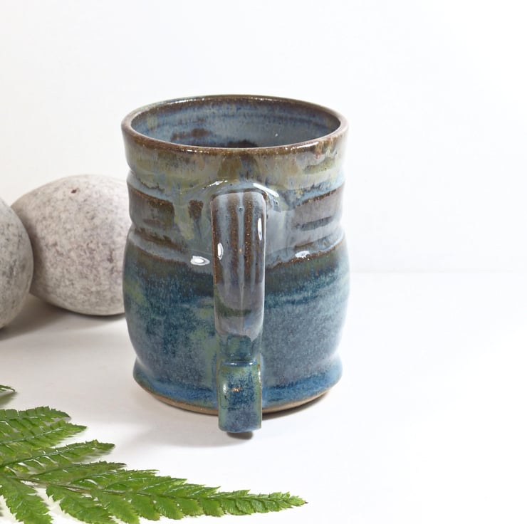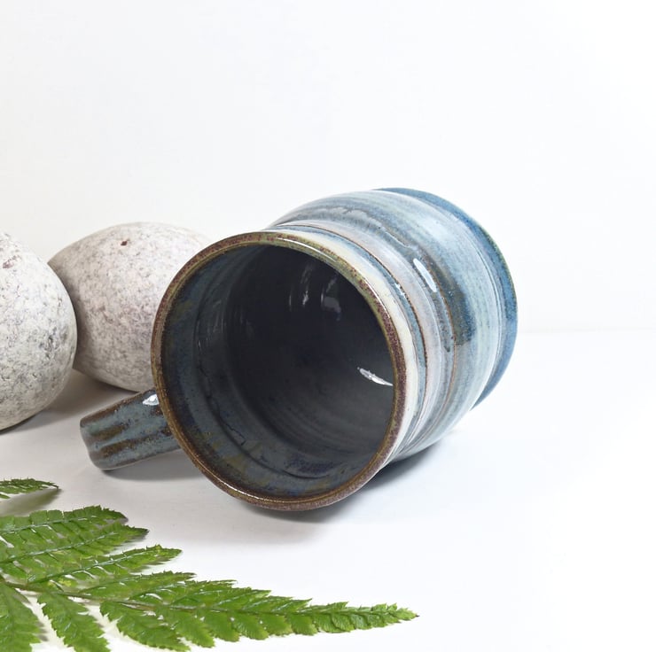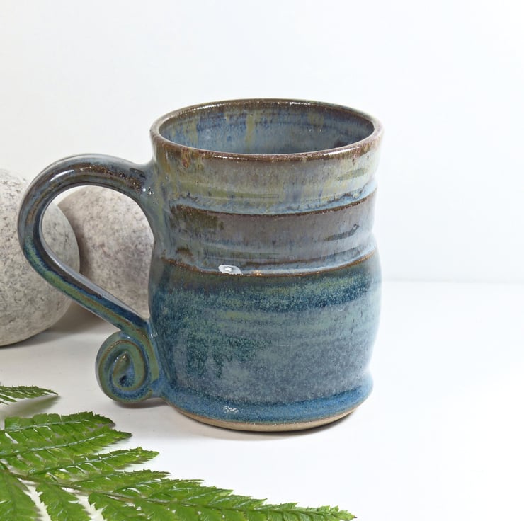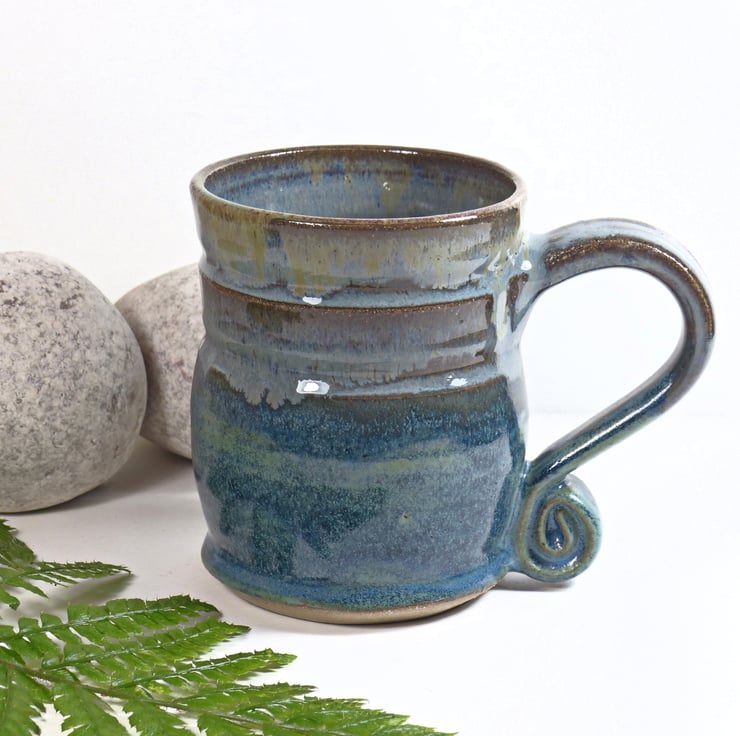 The clay these mugs were made from was dug up from our own island. The spiral handle shows the energy of our lives and the ancient physics of the potters wheel. The glazes reflect the colours that we see in our surrounding lowland pastures and mountains as the seasons change.