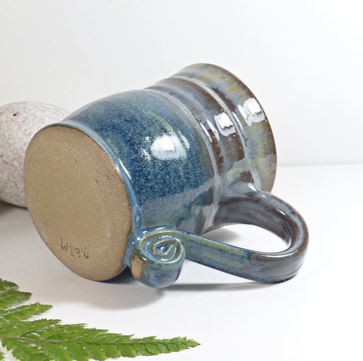 I threw this mug on the potters wheel using a strong stoneware clay. I then added the detail and the spiral handle. It was then fired to a bisque before being glazed in three contrasting and complimentary glazes and re-fired to 1220C.