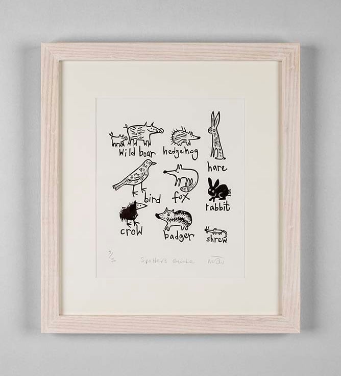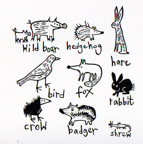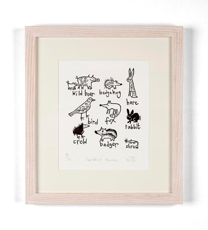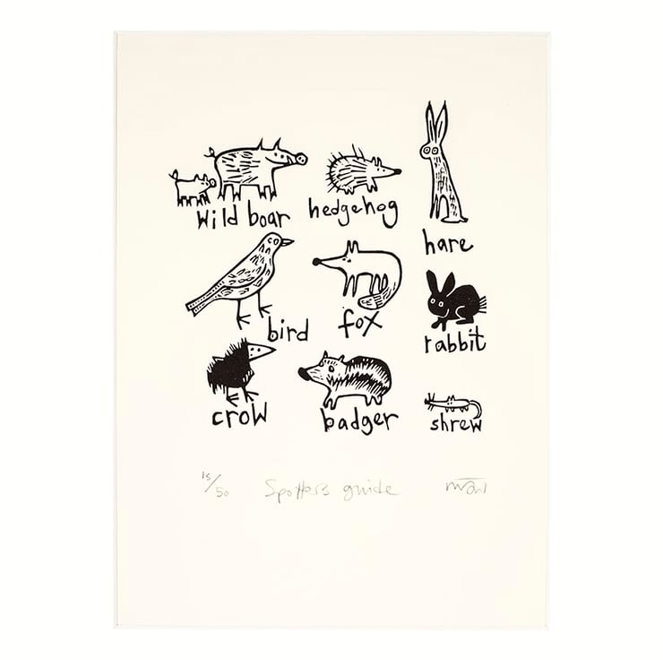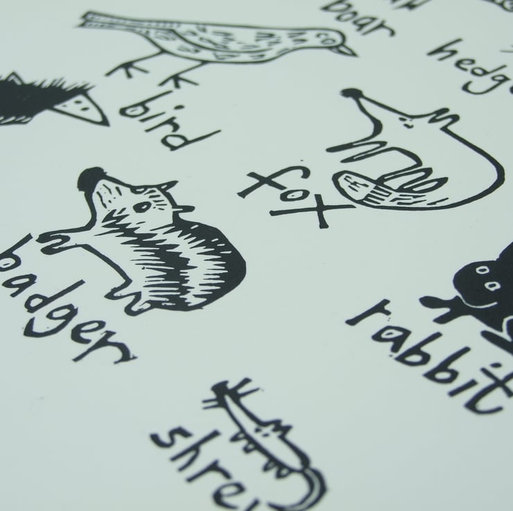 If you've ever seen a creature in your back garden and wondered what it is, this could be the lino print for you! Not guaranteed to identify every known species it features wild boar, a fox, a rabbit, a crow, a badger, a hedgehog, a hare, a shrew and a bird (species unknown) - surely enough to get started with your wildlife spotting...