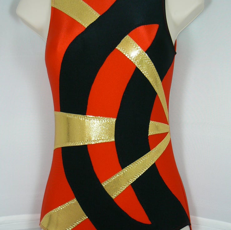 Red sleeveless polo neck gymnastic leotard with black and gold woven applique design on the front and plain red back. Size 3a, chest; 29"-32" waist; 26"-28" hip 32"34" Other sizes made to order please ask.