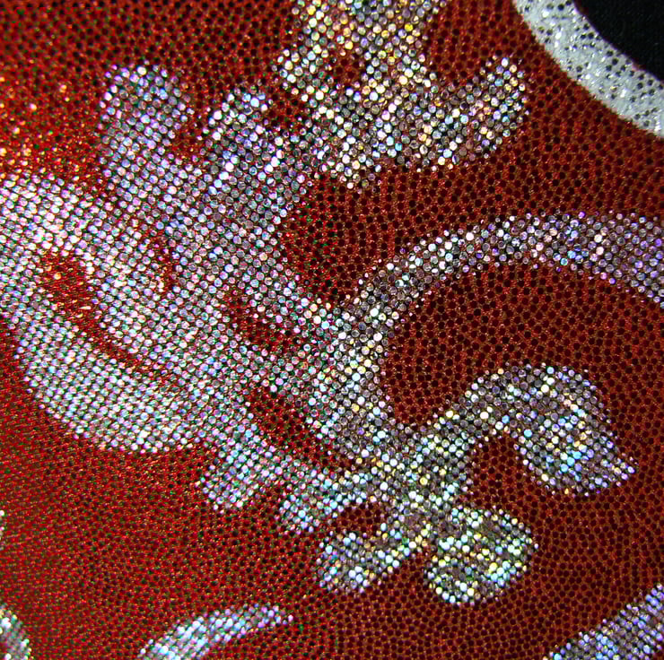 Black vest top gymnastic leotard with red pattered sparkle design edged in silver shine. The pattern continues round the back.Size 3a, bust; 29"-32" waist; 26"-28" hip;32"-34" . Other sizes made to order please ask.
