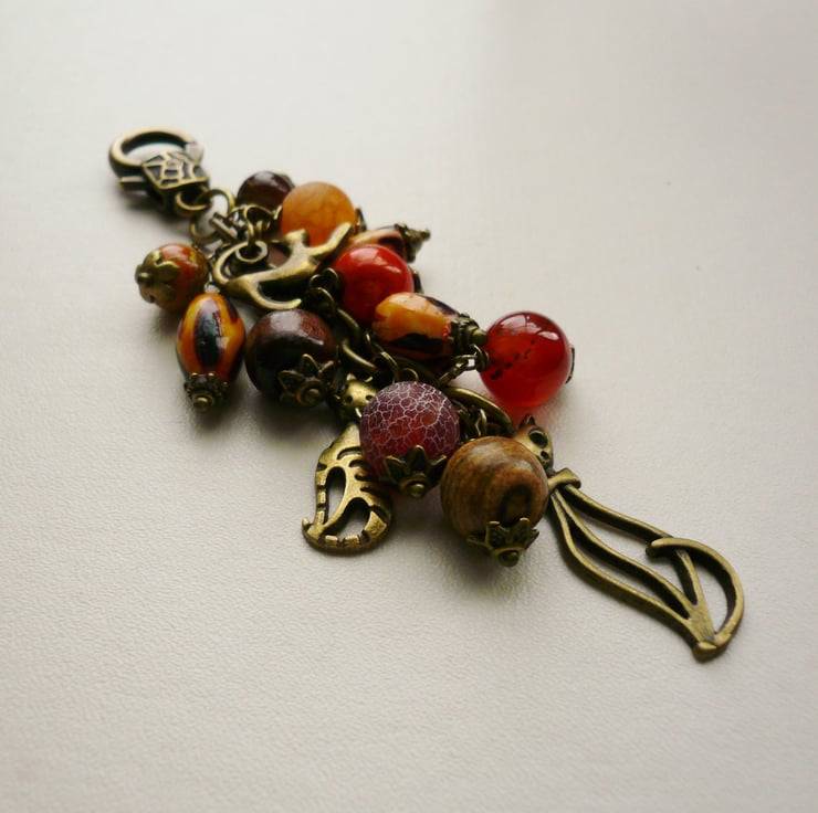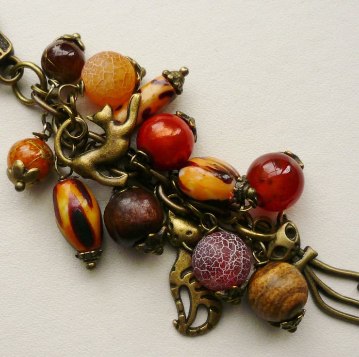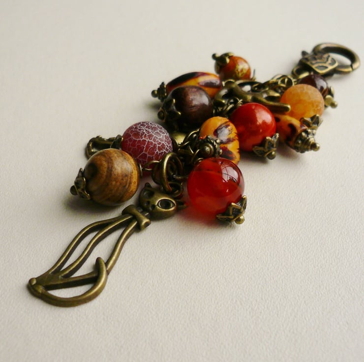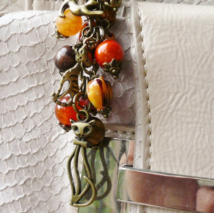 This handbag charm consists of a selection of glass, wood and resin beads in tiger prints and co-ordinating orange and brown tone beads, including picture jasper and frosted cracked agate beads. Bead sizes range from 6mm to 10mm. Also includes three different styles of cat charm in antique bronze, and are all attached to an antique bronze chain and 23mm long trigger clasp.