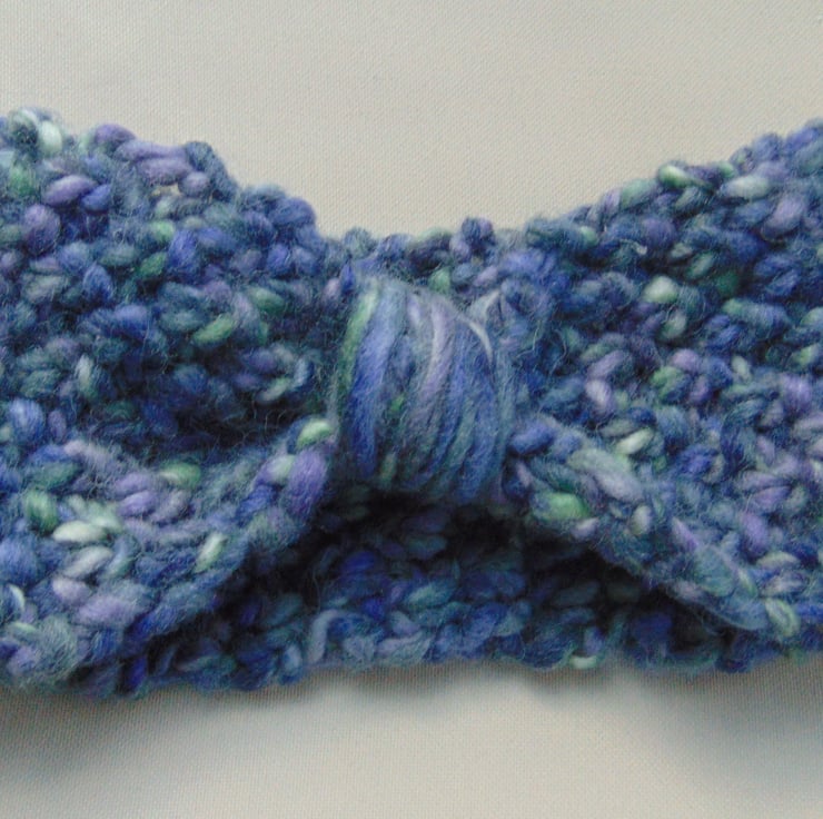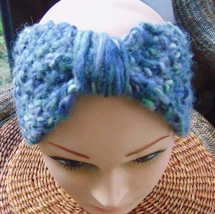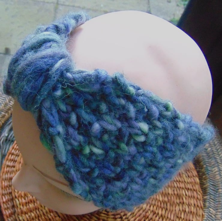 Stylish hand knitted hairband/earwarmer, knitted in gorgeous super chunky, blue varigated mix yarn