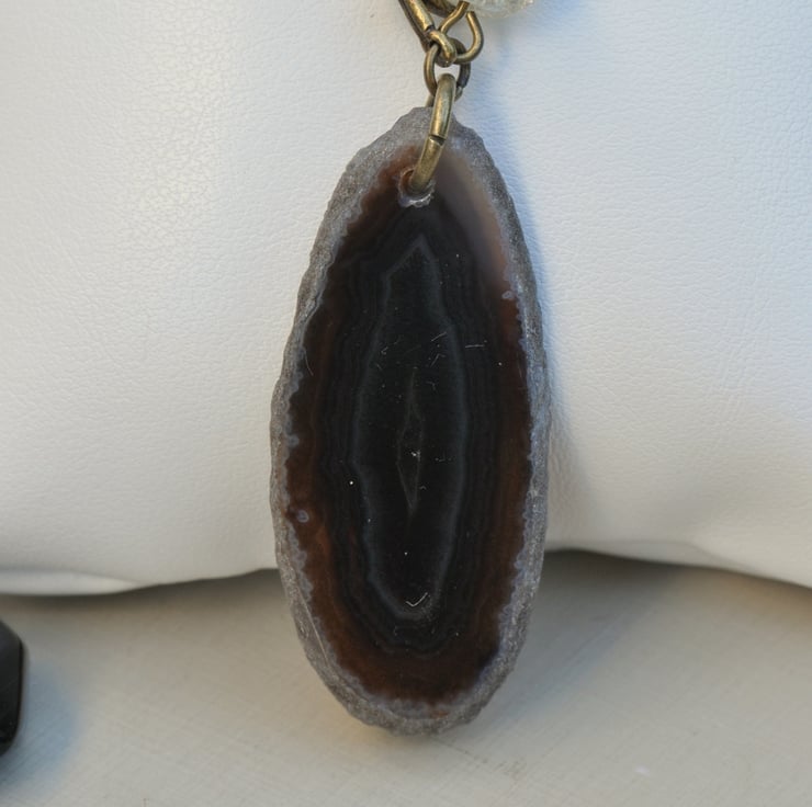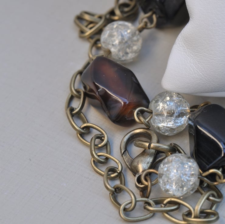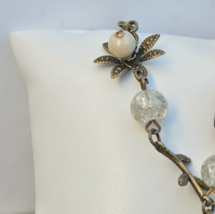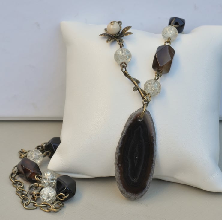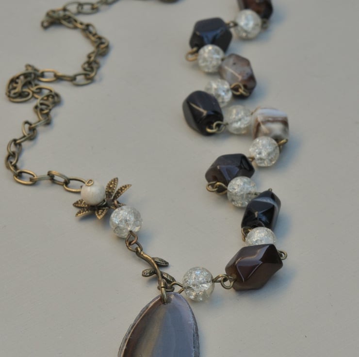 A lovely coffee colour Agate slice pendant is the focal for this necklace. I have added a strand of gorgeous Crackle Quartz gemstone rounds teamed with Black Agate nuggets on one side with a strand of a little antique bronze plated leaf connector with a Crackle Quartz round and a little flower beaded with a Creamstone gemstone round and finished with antique bronze plated chain with a trigger clasp.