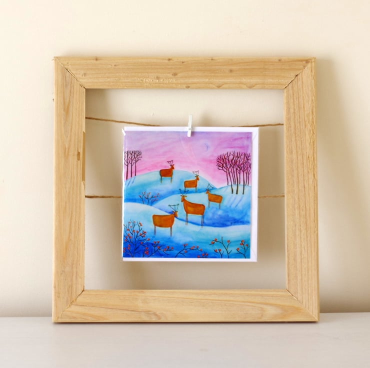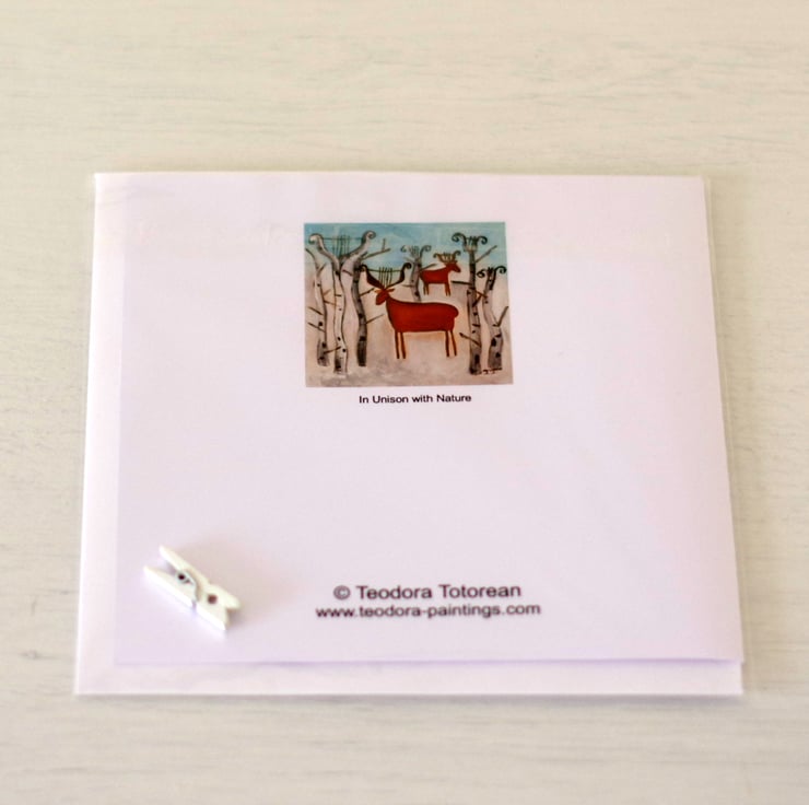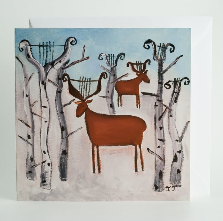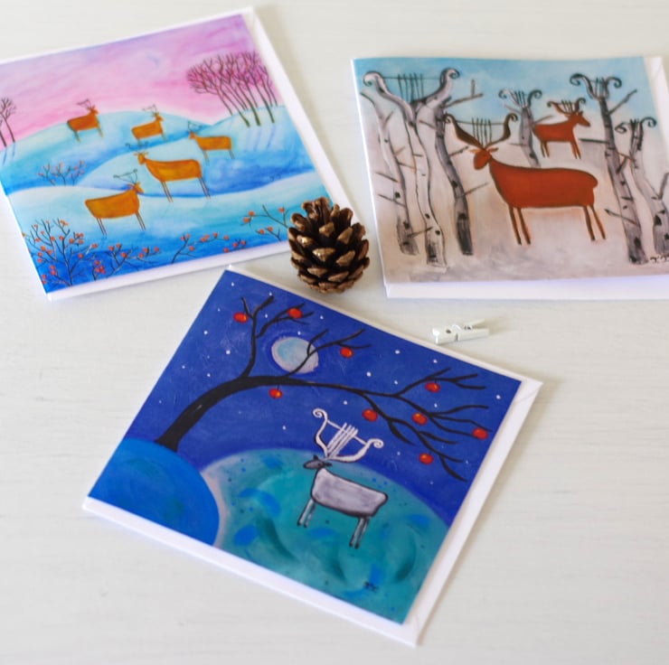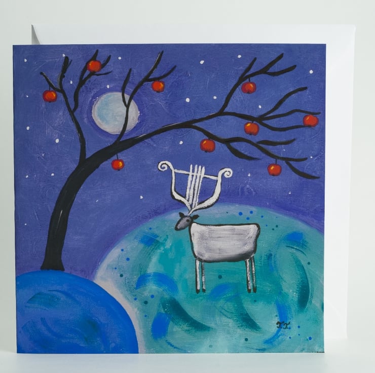 Artist winter/Christmas cards from the collection "Winter Wonderland", featuring an imaginary mythical animal looking like a reindeer with lyra. The listing is for three cards, printed on 270 GSM card, they come with envelope and cellophane bag for protection. They can be framed as mini art prints.