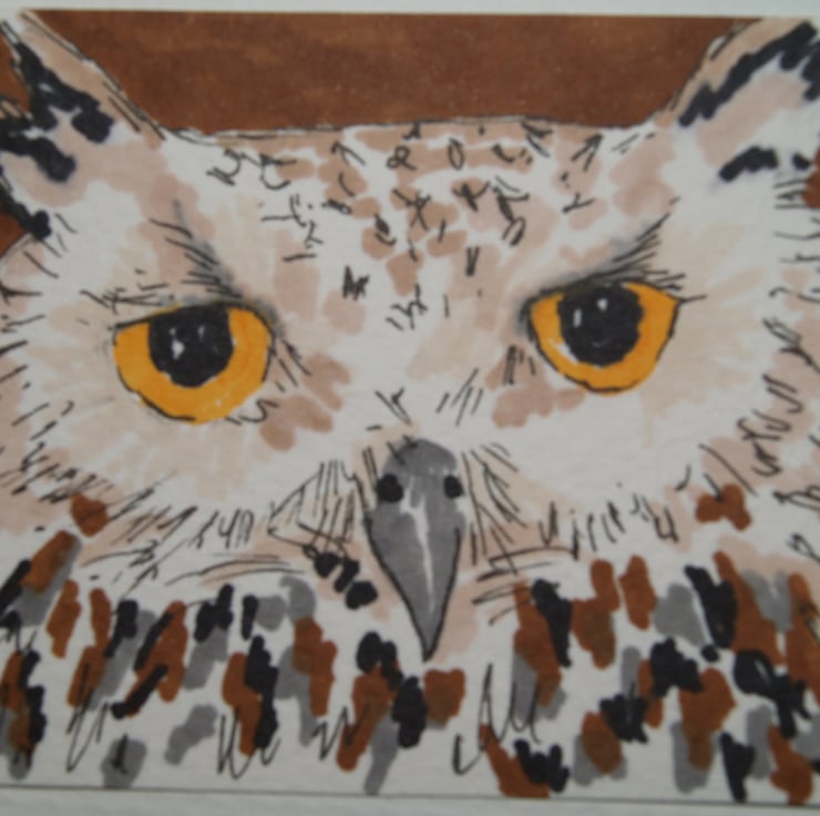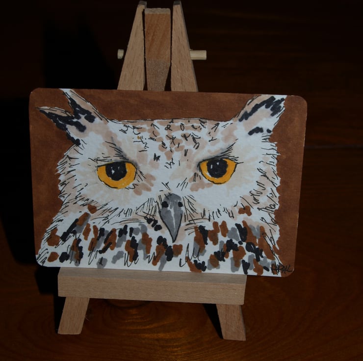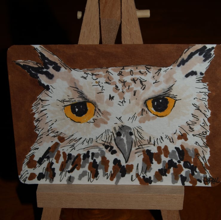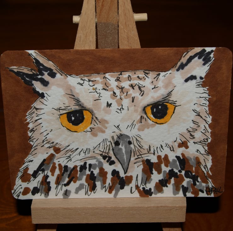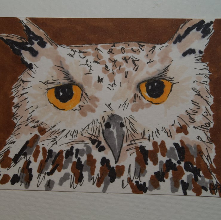 This ACEO is an original, hand drawn view of an owl. It measures 2.5 x 3.5 inches (63 x 89mm), and was created using Promarkers, pencils and ink.