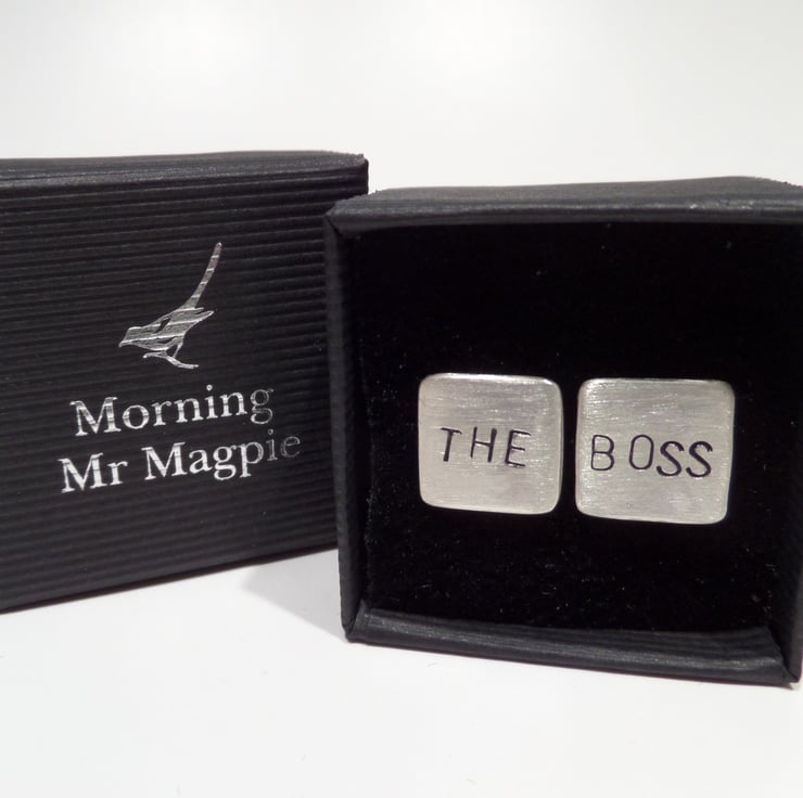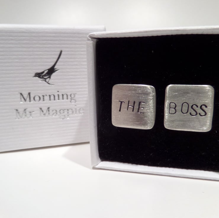 These cufflinks are made from 12x12mm sterling silver squares, and are available in matte or high shine, with black or silver lettering.