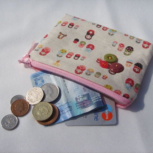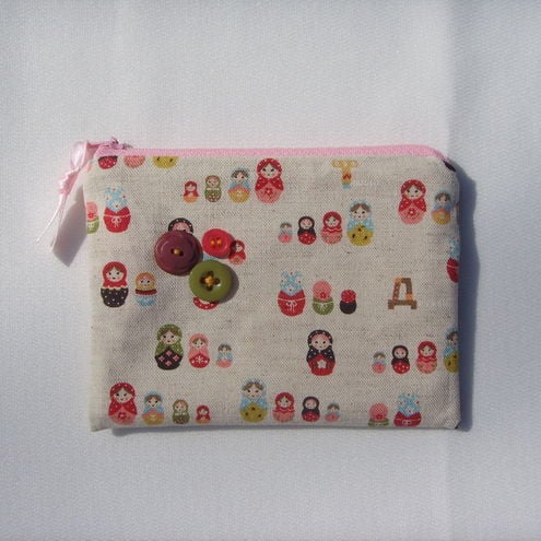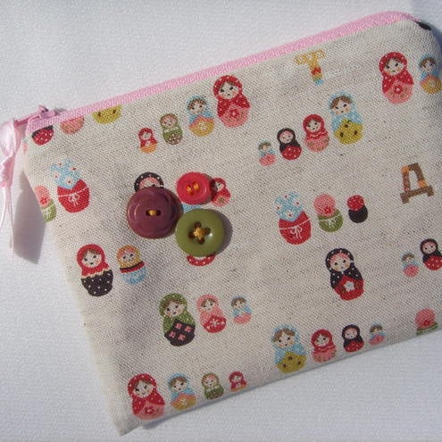 Cute little russian doll purse with pink zip and ribbon, cream lining and matching buttons.