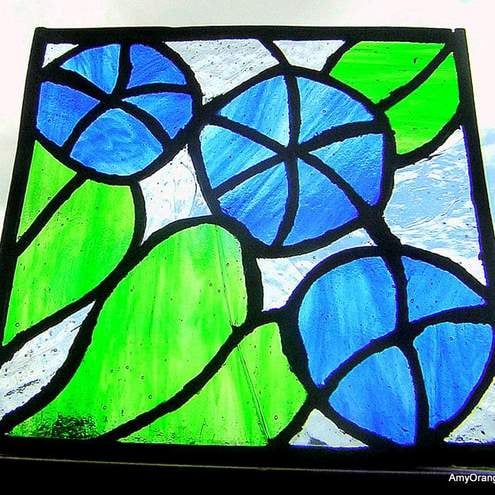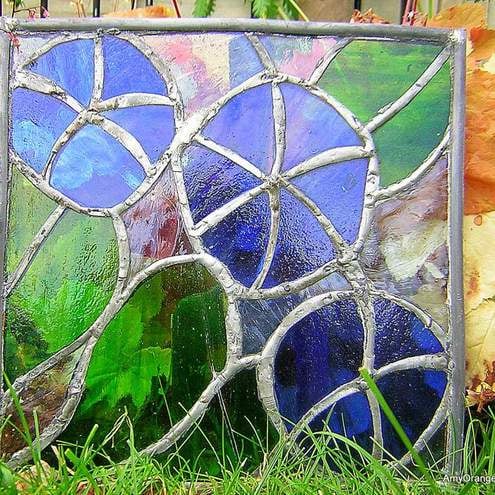 This piece is inspired by a wonderful book of Art Deco fabric prints I came across years ago. It can be hung in a window by a chain, leaned against a window or used as a garden sculpture by pushing it into the ground with legs. I have used gorgeous blue and green stained glass to create this piece and I have used traditional lead and copper foil techniques.