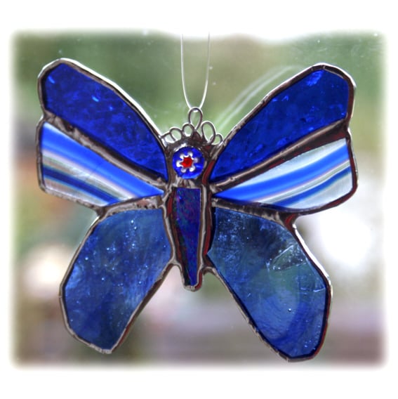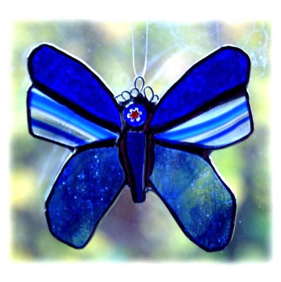 It is a very pretty little butterfly made of lovely shiny shades of bright rblue glass with some streaky bits for added effect.
