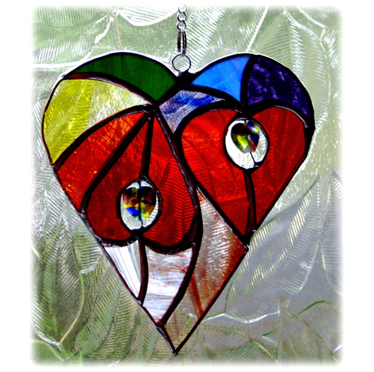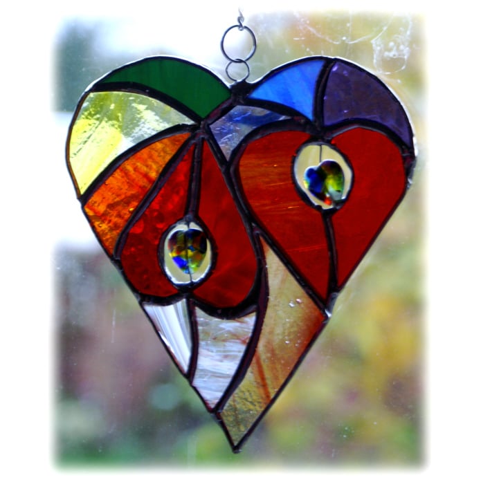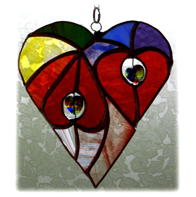 It is a big heart containing 2 smaller, bright red hearts and these are surrounded by different shades of glass in all the colours of the rainbow.