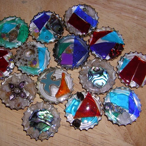 These are funky little beer bottle tops filled with shards of stained glass, shells, found items and costume jewelery covered with a watery topping of resin. Each one is unique and its a lucky dip what you will find in yours! They make a perfect small gift.